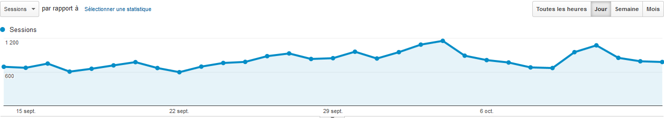 On a encore réalisé des scores plus hauts que ceux enregistrés en septembre ! On a ainsi comptabilisé 25 139 visites du 14 septembre au 14 octobre, ce qui donne une moyenne de 800 visites par jour, pour 12 116 visites uniques, soit 390 tout de même environ par jour. 122 433 pages ont été vues (ça comprend les articles, les topics, etc.) pour une moyenne page/session de 4,87 et de durée 04:24.