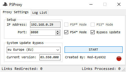 C’était sans compter sur le développeur Red-EyeX32 ! C’est en effet un petit compromis qu’il nous offre ici avec la version 2.0 de son soft PSProxy. Pour les habitués, ce soft disponible sous Windows reprend exactement le même concept que celui de Vita Update Blocker. Pour simplifier, vous allez faire transiter la connexion internet de votre PS4 par votre PC. Ce dernier interceptera le message « Dernier firmware : 3.55 » envoyé par le serveur du PSN, et le remplacera par « Dernier firmware : 3.50″. Votre PS4, sous firmware 3.50, pensera donc être à jour, et pourra se connecter au PSN.