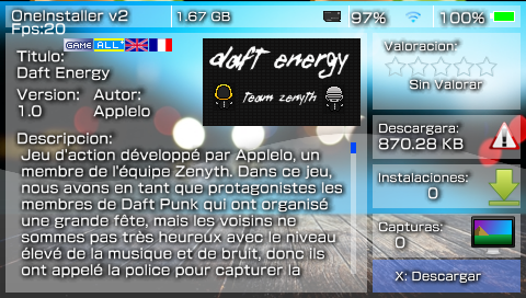 Le One Installer est un utilitaire de la même trempe que le feu HBStore ou PSPInstaller, c’est-à-dire qu’il se présente un peu comme un « marché en ligne » de homebrews (tout étant évidemment gratuit). Développé par Davis9278, sa prochaine version commence déjà à être teasée par son auteur qui promet le support des langues française, anglaise et espagnole. Et, comme toujours, une banque de homebrews toujours plus grande.