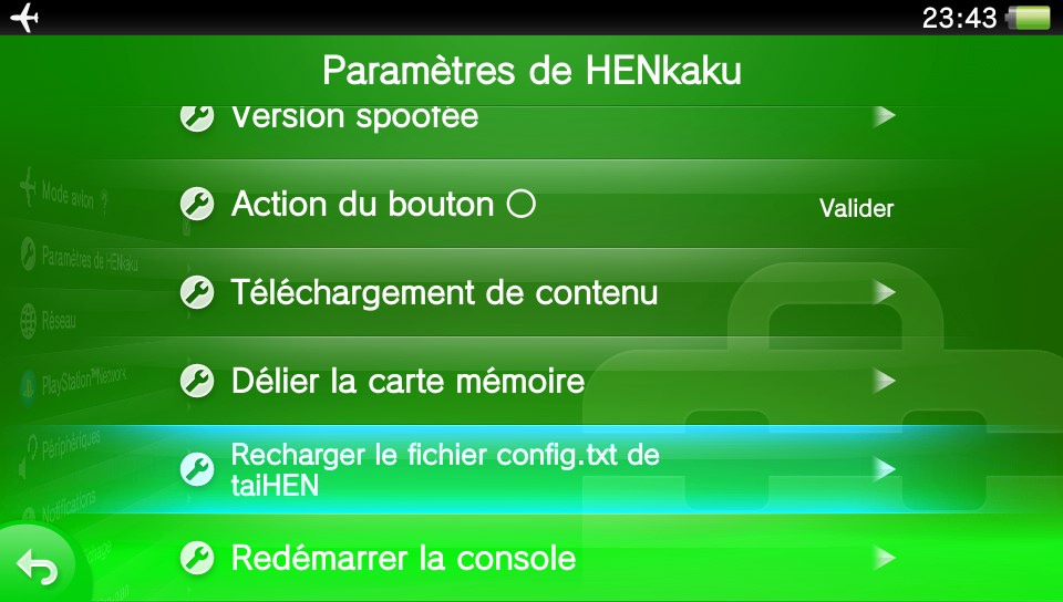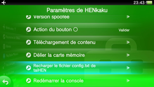 Rendez-vous ensuite dans les paramètres HENkaku (vu la bulle « Paramètres » officielle), afin de recharger le fichier « config.txt » de taiHEN.