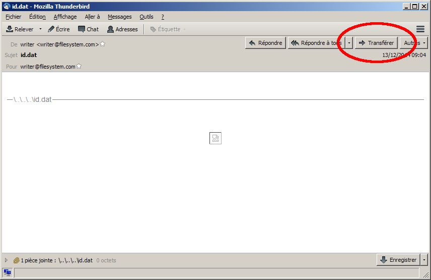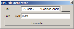 Plus qu’à cliquer sur « Generate », en prenant soin de nommer le fichier sans mettre de point, à ouvrir le fichier EML via Thunderbird ou Outlook, et à vous transférer le mail contenant en pièce jointe notre petit fichier pirate.